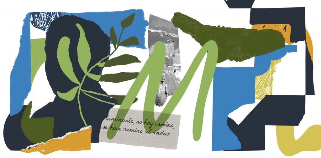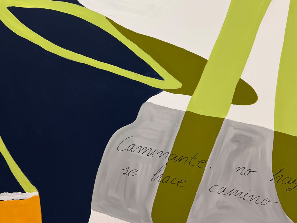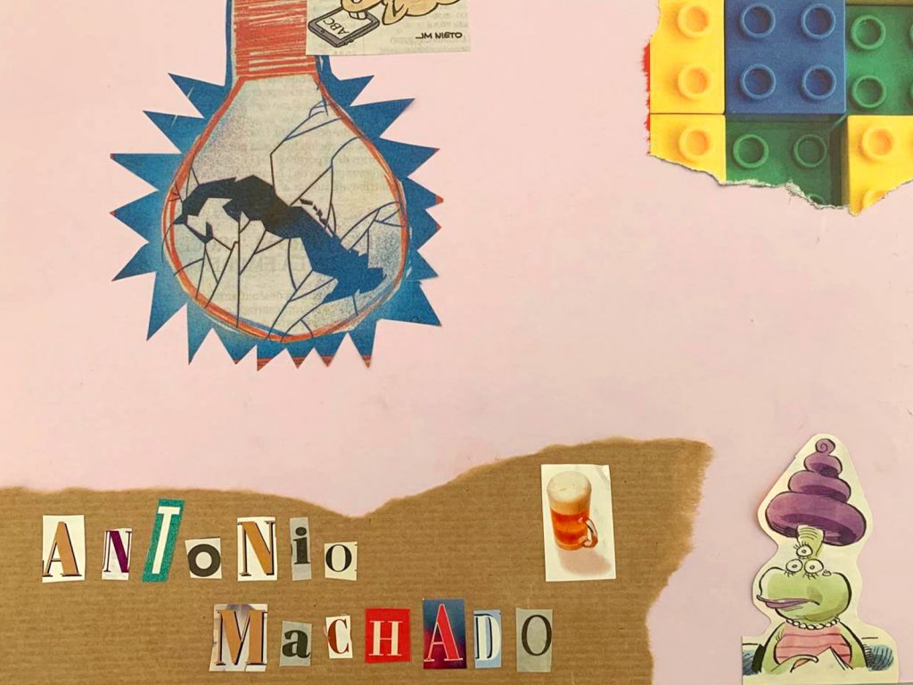 El mural presenta una composición artística creada a partir de recortes, texturas y fragmentos de color, evocando la estética del collage y el reciclaje creativo. Inspirado en la figura de Antonio Machado, el diseño incorpora elementos poéticos y simbólicos asociados a su obra. En la sección central también aparece la brújula de PEAC, el símbolo representativo del programa para alumnado de altas capacidades del centro.